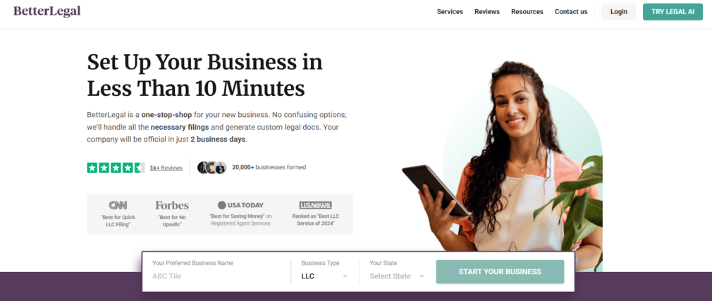 BetterLegal provides business formation services in all 50 U.S. states, allowing entrepreneurs to form their businesses and open bank accounts across the country. The service is designed for entrepreneurs who need to launch their business quickly.